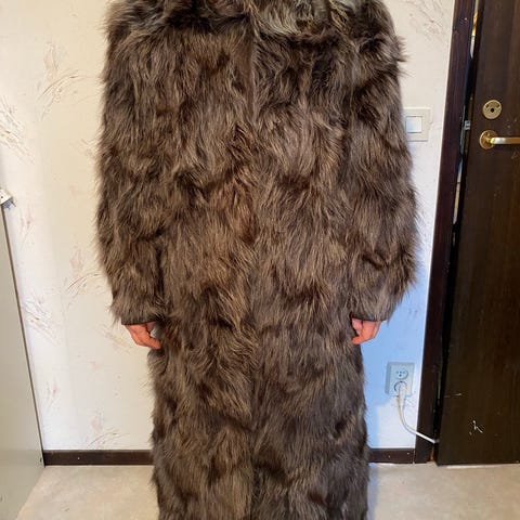 Jätte fint pälsytterplagg för dam i storlek M. Lång brun modell med huva och markerade ärmar i mörkare ton. Tillverkad i pälsmaterial, avsedd som ytterplagg. Passar som varm jacka eller kappa vid kallare väder.