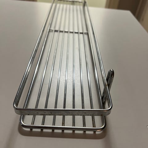 Hörnhylla för dusch med fyra hyllplan. Fristående modell som placeras i hörn. Svart färg med perforerat mönster i hyllplanen för avrinning. Tillverkad i metall/plastkombination (enligt bild). Lämplig för förvaring av schampo, tvål och andra duschartiklar i badrum.