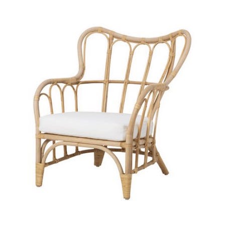 Två fåtöljer i rottinglook i beige färg, avsedd för utebruk eller balkong/uteplats. Stolarna har hög rygg och sits uppbyggd av flätade band samt benställning i metall. Passar som sittmöbel på balkong, altan eller i uterum och kan kombineras med dynor eller kuddar för ökad komfort.