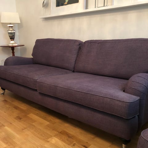 Säljer två mörklila fåtöljer i fint skick. Bekväma och stadiga med träben och hjul framtill. Passar bra i vardagsrum eller läshörna.