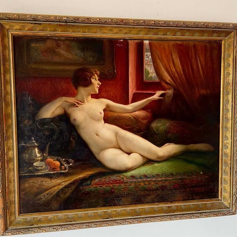 Ovalt porträttfoto med motiv av kvinna i böneställning. Fotot är inramat i en brun, oval ram med glas. ca. 20 x 15 cm.
