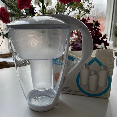 Clearly of Sweden vattenfilterkanna i vit plast. Kannan har inbyggt filterinsats och är avsedd för filtrering av kranvatten i hushåll. På bilderna syns även en separat filterpatron med 4-stegs filtreringssystem som passar till kannan. Kannan fylls uppifrån via öppningsbart lock och filtrerar vattnet ner i behållaren. Lämplig att förvara i kylskåp eller på köksbänk för dagligt bruk. Ny pris 1295:-, ny filter ingår