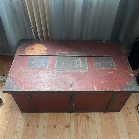 Antik kista med vackra mönster, Mönstrerna går runt över hela kistan och har metall på sidorna. Låset funkar ej men givet dess ålder är den i bra skick.