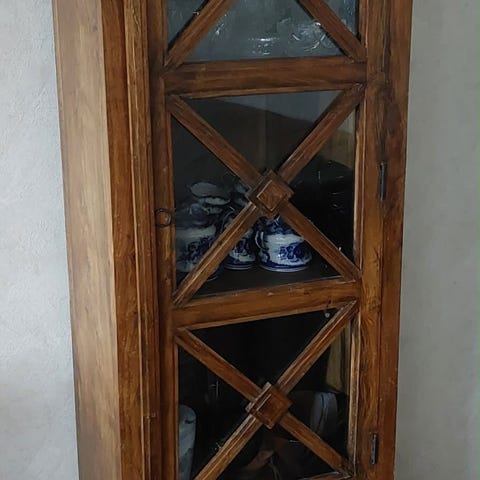 Vitrinskåp i trä med brun faner och flera förvaringsdelar. Skåpet har både övre och nedre skåpsdelar med dörrar samt öppna hyllor. I mitten finns en vitrindel med glasdörrar och glashyllor, lämplig för förvaring och exponering av glas, porslin eller prydnadsföremål. Underdelen ger extra förvaringsutrymme för exempelvis porslin, dukar eller andra hushållsartiklar. Passar i vardagsrum eller matsal som kombinerad förvaring och utställningsmöbel. Den är i 3 delar och är enkel att skruva isär / ihop.
