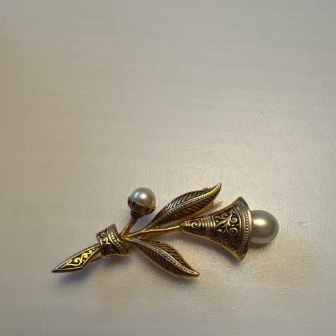 Värde: Liknande vintagebroscher säljs ofta på auktioner för varierande belopp beroende på material och skick.