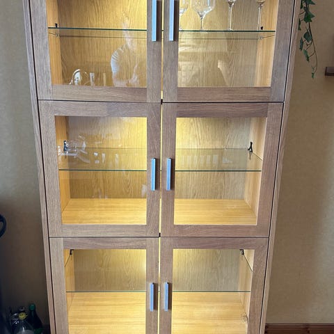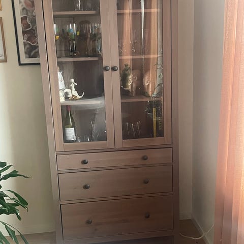 Vitrinskåp i trä med glasdörr och flera glashyllor. Skåpet har två utdragslådor längst ned för extra förvaring. Passar för förvaring och exponering av glas, porslin eller prydnadsföremål i vardagsrum, matsal eller kök. Neutralt utförande som kan kombineras med olika inredningsstilar.