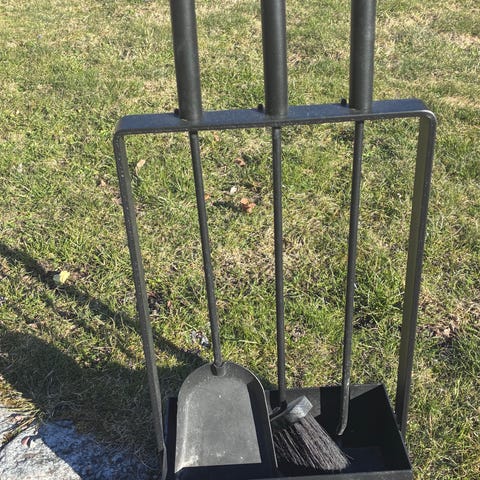 Brasställ, eldverktyg samt golvljusstake i svart smide