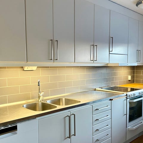 Då köket är platsbyggt är det framför allt fronterna som säljs, dock kommer väggskåpet med lutande skjutdörrar tas ned i sin helhet.