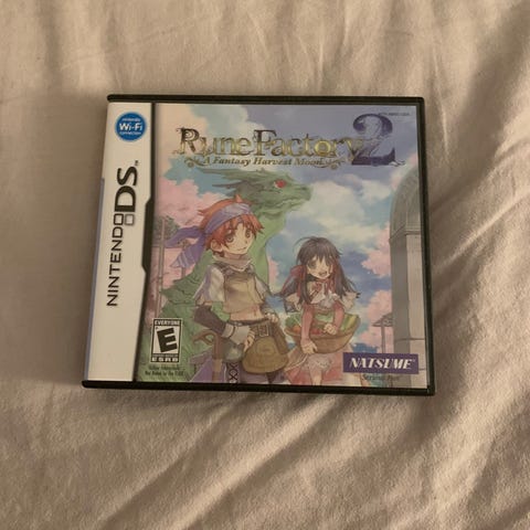 Nintendo DS Harvest Moon DS The Tale of Two Towns spel. Fysiskt Nintendo DS-spel i plastfodral med spelkassett och tryckt omslag. Spelet är PEGI 3-märkt och avsett för Nintendo DS-konsoler. Genre är jordbruks- och livssimulatorspel där spelaren driver en gård och interagerar med invånare i två olika byar.