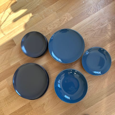 6st tallrikar i tjockt porslin, grå ovansida, rosa undersida. 50kr för alla 6.