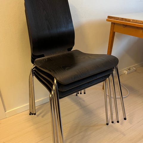 4 st praktiska och stapelbara trästolar i mkt bra skick. Pris: 350 kr för alla
