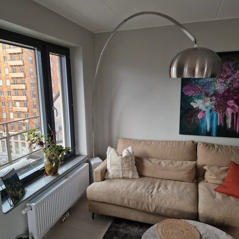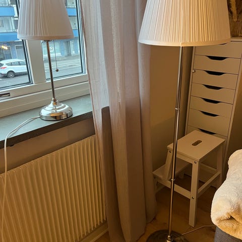 Stilren golvlampa i metall med svart, cylindrisk lampskärm och stabil rund fot från IKEA. Passar perfekt vid soffan/fåtöljen och ger ett mjukt, riktat ljus. I mkt bra skick som ny.