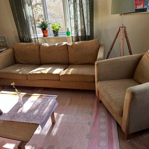 Mycket fin bäddsoffa bortskänkes fullt fungerande och fräsch med tanke på ålder. Gedigen konstruktion. Riktig kvalitetsmöbel. Inte ikea, vet inte märke, kan vara design, även fåtöljer som passar till säljes. Även dem riktigt gedigna kvalitetsmöbler.