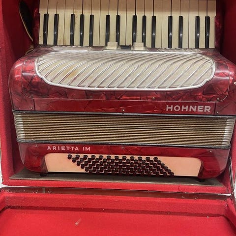Pianoackordeon med tangenter på höger sida och basknappar på vänster. Alla tangenter och knappar rör sig, men det har inte servats på länge. Eftersom jag inte spelar själv kan jag inte bedöma stämningen.
