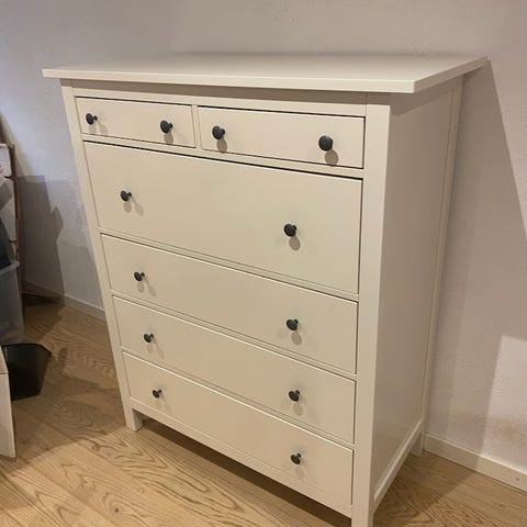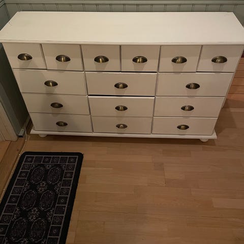 Set med möbler. Byrå jysk vitlaserat trä ok skick höjd 90 cm bredd 89 cm 5 st lådor samt skåphylla till höger, stolar 3 st karl johan stil höjd 88,5 sitthöjd 45 cm, skrivbord äldre vintage stil,1900-tal första hälft, vit målad i trä. Höjd 77cm bredd 115 cm djup 62 cm.