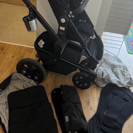 Nytvättat. Liggdel, två sittdelar fram och bakvänd samt babyskydd som går att sätta på vagnen med clips som följer med. Bilden visar en av siddelarna där barnet sitter framåtvänd. Solskyddet har en liten tittlucka i plast för ner barnet är framåtvänd.