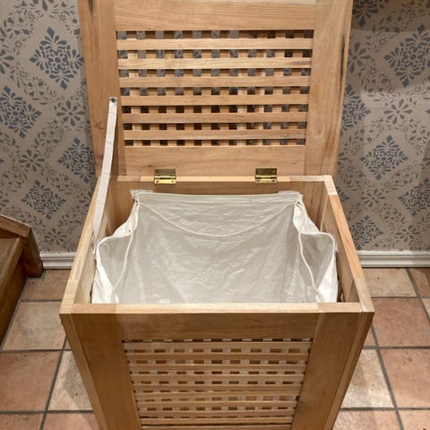 Tvättkorg (kommer inte ihåg varifrån) i flätad rotting med lock. Korgen har en ljus tyginnerpåse som går att lyfta ur och är indelad i två fack för sortering av tvätt.