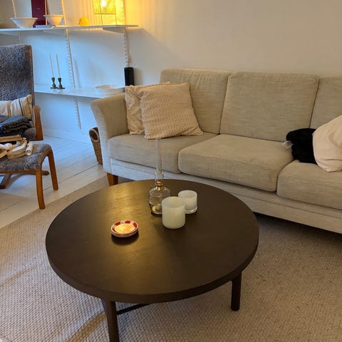 Soffbord i teak med tidningshylla med 2 mörka områden. Därav priset. I övrigt fint och stabilt bord. Tidningshylla hel.