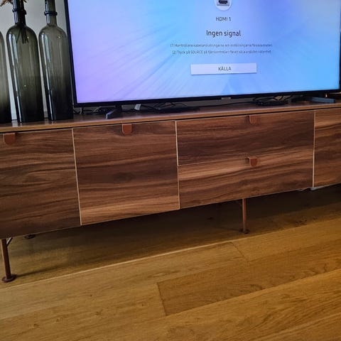 Tv-bänk i valnöt med flera förvaringsfack bakom luckor. Bänken står på ben i metall med mässingsfärgad yta.