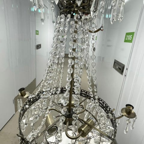 Bolid taklampa i krom och klara prismor i glas. Diameter 50 cm höjd 2m