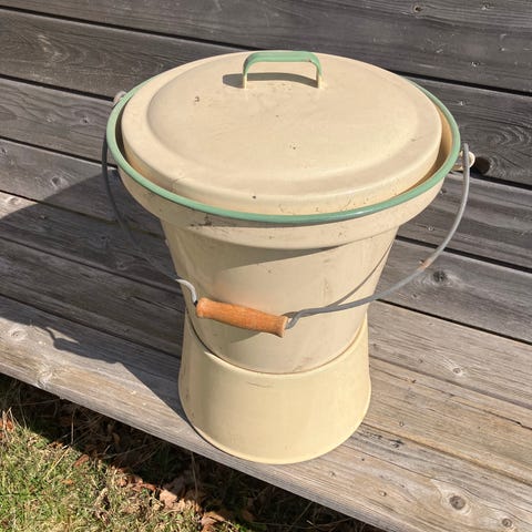 Gammal brandsläckare med fast monterad handpump. Cylindrisk modell med bärhandtag och rör/pumpanordning fäst i hinkens sida. Invändigt syns rost, litet hål i botten samt slitage. Kan användas som dekoration, rekvisita eller för enklare utomhusbruk där utseende är viktigare än skick.