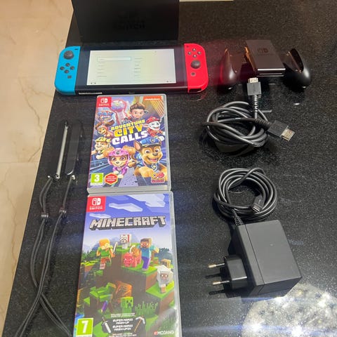 Nintendo Switch 2 spelkonsol med avtagbara Joy-Con‑handkontroller i blått och rött. Konsolen kan användas både som bärbar enhet och kopplad till dockningsstation för spel på TV. På bilderna syns även två fysiska spel samt ett fodral som fungerar som stöd för konsolen. Lämplig för en eller flera spelare och kan användas med kompatibla Nintendo Switch‑spel och tillbehör.