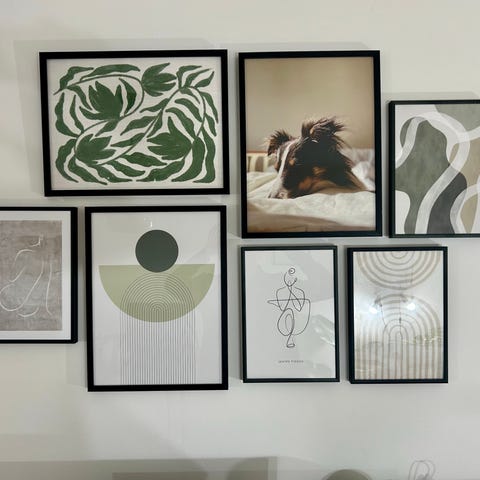 IKEA Hovsta tavelramar set i ljust trä inklusive motiv. Setet består av 8 ramar i olika storlekar avsett för väggmontering.