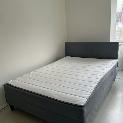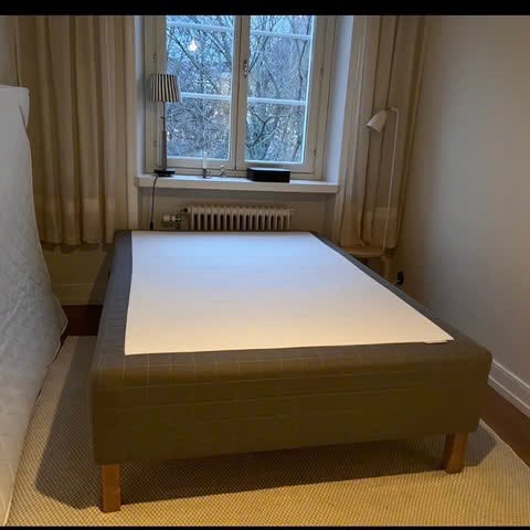 Ca fem år gammal. Sparsamt använd. Vi har använt som extra säng i gästrummet. Bäddmadrass kan följa med, men den är lite fläckig i tyget (det är avtagbart och kan tvättas)