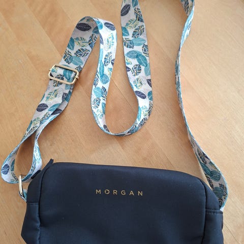 Axelremsväska med en framsida täckt av guldglittrande paljetter. Baksida i slätt fuskläder. Smal axelrem i svart material. Passar för mindre tillhörigheter som mobil, nycklar och plånbok vid till exempel fest eller andra tillfällen där en mindre väska önskas.