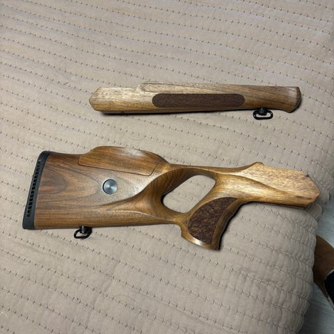 Framstock och kolv passande Sauer 202 standardlåda, ej magnum. Har suttit på en 202 Luxus, så sannolikt Grade 6, då dessa hade det. Pistolgreppsrosett och framstocksavslut i jakaranda. Fint skick i både yta och nätskärning. Har dock en mindre defekt i form av en liten inbuktning vid framstocksavslutet. Därav priset. Nya original rembyglar. Säljes endast komplett. Priset är ej förhandlingsbart. Köpare står för eventuell fraktkostnad.