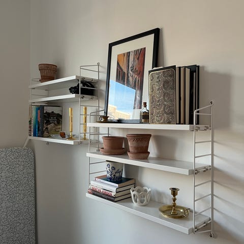 Ljust grå stringhylla med tre hyllplan och en tidningshylla. Varsamt använd och i fint skick