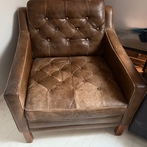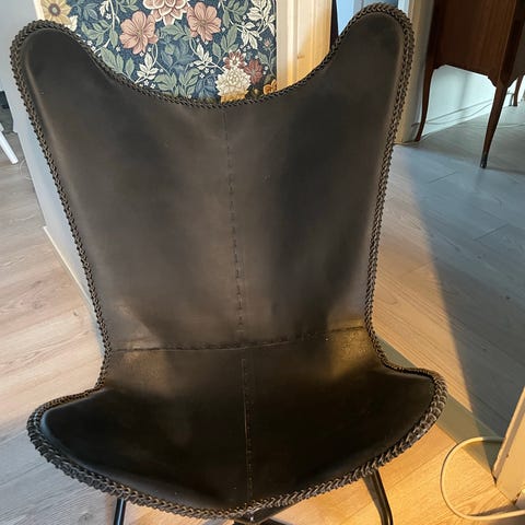 Säljes läderlappsfåtölj med brun stålram. Fåtöljen är i brunt läder med sömmar av läder. Brunlackad stålram. Säljes i befintligt skick.