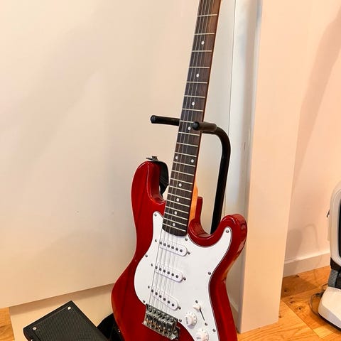 Harley Benton ST-20 elgitarr i röd finish. Klassisk ST-kroppsform med tre singlecoil-mikrofoner, volym- och tonkontroller samt 5-lägesswitch. Lönnhals med greppbräda i mörkt trä och 6-in-line stämskruvar. Passar för elgitarrspel inom flera musikstilar.