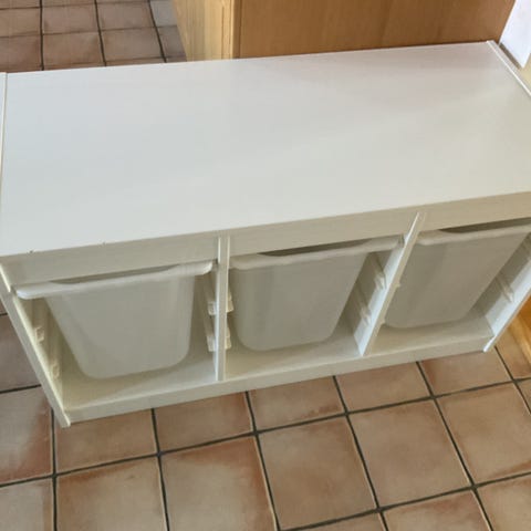 IKEA Trofast förvaringshylla i trä. Hyllan är väggmonterad och har flera utdragbara metallkorgar som ger öppen förvaring. Trästommen är i ljust trä och korgarna är i nätmetall. Mått enligt skiss: längd cirka 93 cm, djup cirka 21 cm. Se bild. 500kr.