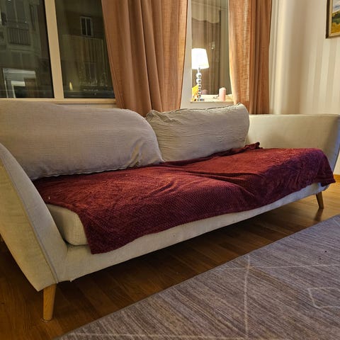 Soffa kivik bortskänkes. Katt har rivit på den och solen har blekt den svarta manschestern. Tyg går ej att byta men lägg en filt över så har du en bekväm soffa. Åker på tippen imorgon.