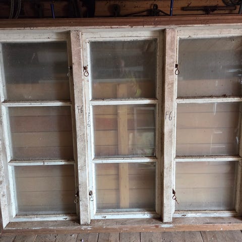 Fönster från glasveranda och några vanliga fönsterbågar säljes. Fyra innerfönster och sex ytterfönster som kan göras om till vitrinskåpsdörrar eller speglar. Se inspirationbild! Ytterligare 5 bågar som kan användas till exempel drivbänk eller växthus. Tillverkade 1937.