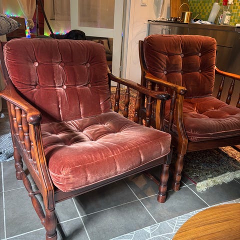 De är använda, med tydliga slitage och repmärken på sits och rygg (se bilder). Fortfarande stabila och fullt användbara, perfekta för exempelvis lounge, sommarstuga eller kontor.