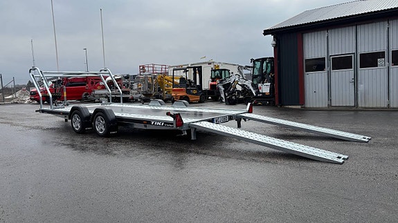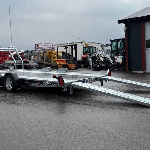 Detta lagersläp är utrustat med hydraulisk tilt, ramper och fällbara lämmar. Perfekt för maskintransport och biltransport.