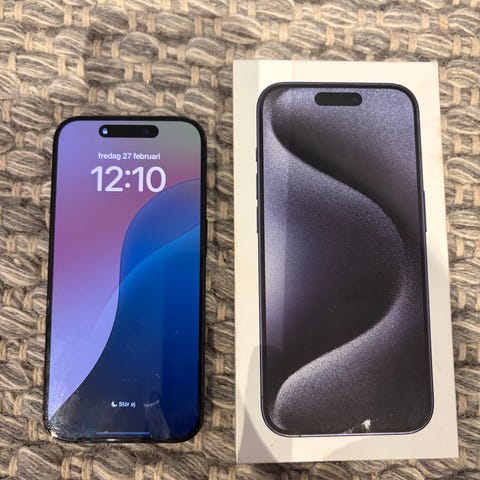 Säljer min IPhone 15 PRO. Den är ca två år gammal. Fungerar felfritt. Men batteri hälsan börjar bli låg (88%) & finns en liten spricka i höger hörn på framskärmen (se bild 1). Syns inte när den används. I övrigt inga skavanker och i bra skick.