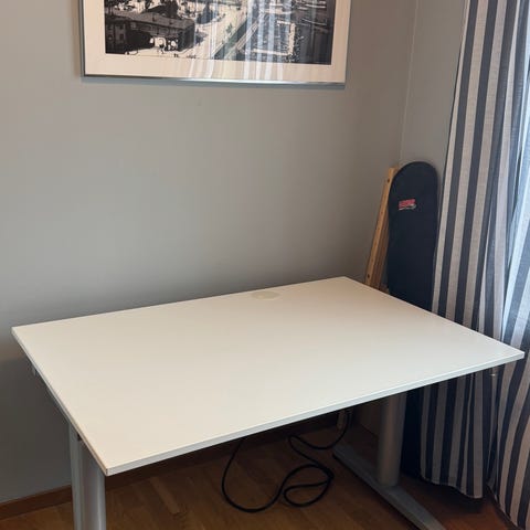 Höj- och sänkbart skrivbord i vitt utförande. Bordet har rektangulär bordsskiva och två ben med T-fot. Höjden justeras elektriskt med kontrollenhet monterad under bordsskivan. Passar som arbetsbord i kontor, hemmakontor eller studiemiljö där man vill kunna växla mellan sittande och stående arbete.