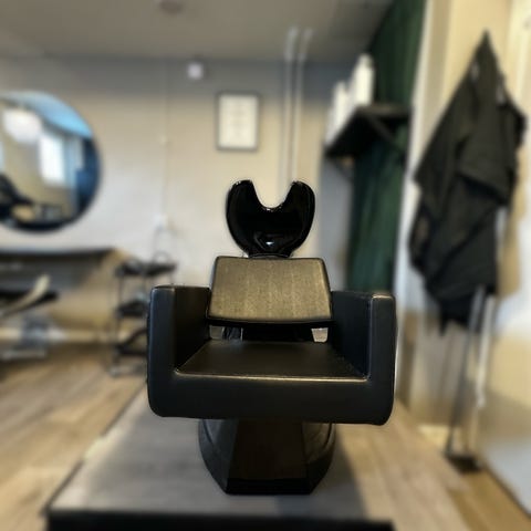 Frisörstolar i svart utförande med fyrkantig fotplatta och fotstöd. Stolen har stoppad sits och ryggstöd med raka armstöd i metall.