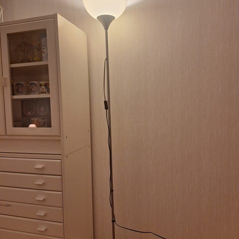 Säljer en snygg och tidlös IKEA golvlampa i vit metall med grenig stam som delar sig i två separata, böjda armar – vardera med en stor, konformad/vit skålformad lampskärm (typ bowl shade). Ger både riktat läsljus och fint uppljus mot taket. Perfekt för vardagsrummet, läshörnan eller soffan!
