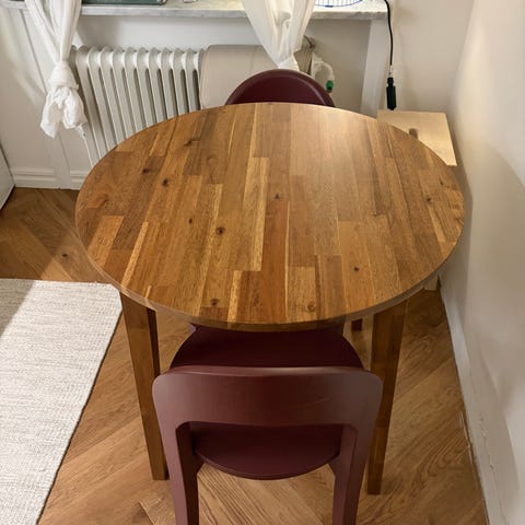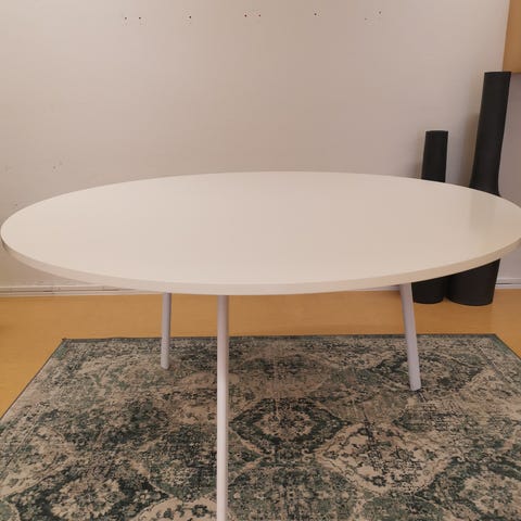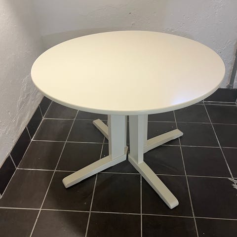 IKEA runt bord i vitt utförande. Bordet har rund bordsskiva och korsformat underrede med fyra ben. Passar exempelvis som matbord, köksbord eller mindre arbetsbord i hemmet eller på kontoret.