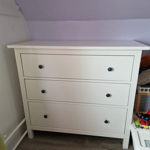 Vit Hemnes byrå med tre lådor. Lådorna rullar bra, byrån är i fint skick förutom några synliga repor (se bilder). Väggfäste medföljer.