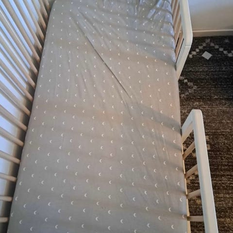 IKEA spjälsäng i gråtmålat trä. Klassisk modell med ribbor runt om och helgavlar. Sängen har en ribbotten i trä och tre lådor under för extra förvaring av till exempel sängkläder eller leksaker. Passar standardmadrass för spjälsäng (madrass ingår ej). Lämplig för små barn som sover i spjälsäng.