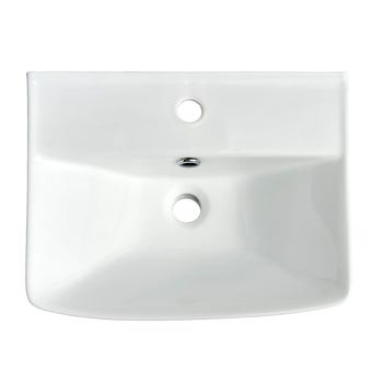 Väggmonterat handfat i vitt porslin. Rektangulär form med avrundade hörn och integrerad bräddavlopp. Monteras direkt på vägg med synligt avlopp under. Passar för mindre badrum, gästtoalett eller wc. Blandare och bottenventil kan monteras i det förberedda blandarhålet och avloppshålet i tvättstället.