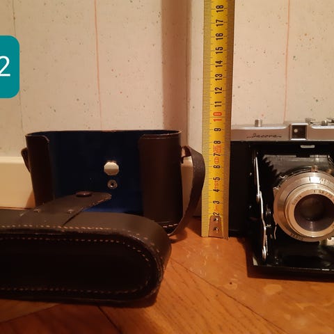 Zeiss Ikon Ikonta bälgkamera i klassiskt utförande. Kameran är en analog mellanformatskamera med utdragbar bälg och mekanisk slutare. Objektivet är monterat i en central slutare på frontstandarden. Kameran levereras tillsammans med brun läderväska med axelrem samt medföljande tryckt material/manual på svenska. Passar för analog fotografering med rullfilm (format enligt Ikonta‑serien) eller som samlarobjekt och rekvisita.