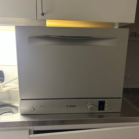 Bosch bänkdiskmaskin, används dagligen och fungerar felfritt. Ni får med inlopps- och avloppsslang, samt en koppling som går att ansluta kökskranen, se bild.