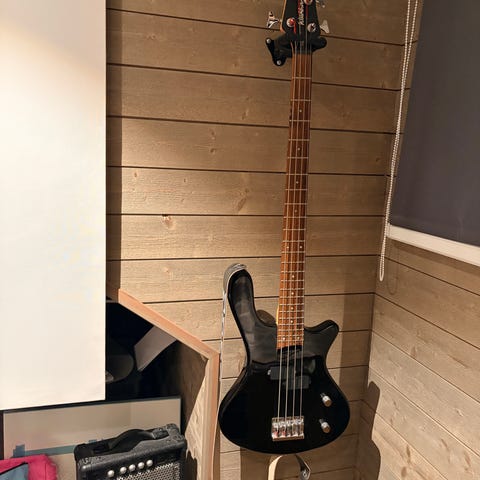 Washburn T12 elbas i svart utförande. Fyrsträngad modell med solid kropp och bolt-on-hals. Enkelt stall och en mikrofon med volym- och tonkontroll. Passar för elförstärkt spel i olika musikstilar. Kroppen är lackad i blank svart finish och halsen är i ljust trä med greppbräda i mörkt trä. har haft länge hängande och kom inte till nytta.