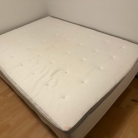 IKEA säng grå 140x200 med bäddmadrass. Sängen står på ben i ek och har en vit bäddmadrass ovanpå. Passar som enkel/dubbelsäng i sovrum eller gästrum.